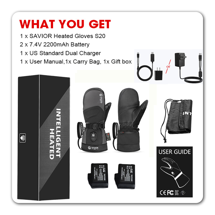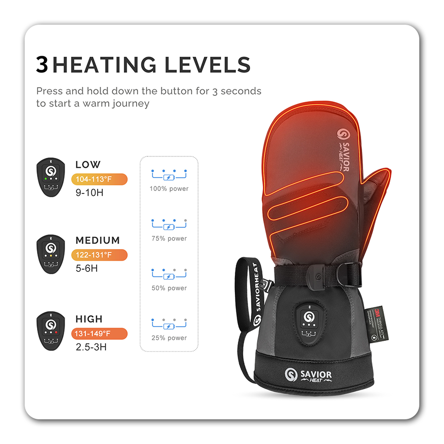 Heating System: 7.4V/7.5W heating sheet covering five fingers, fingertips, and back of hand.