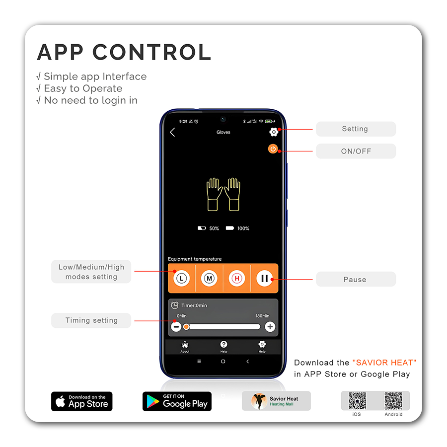 Temperature Control: Bluetooth switch with LED battery indicator; 3 heat levels: